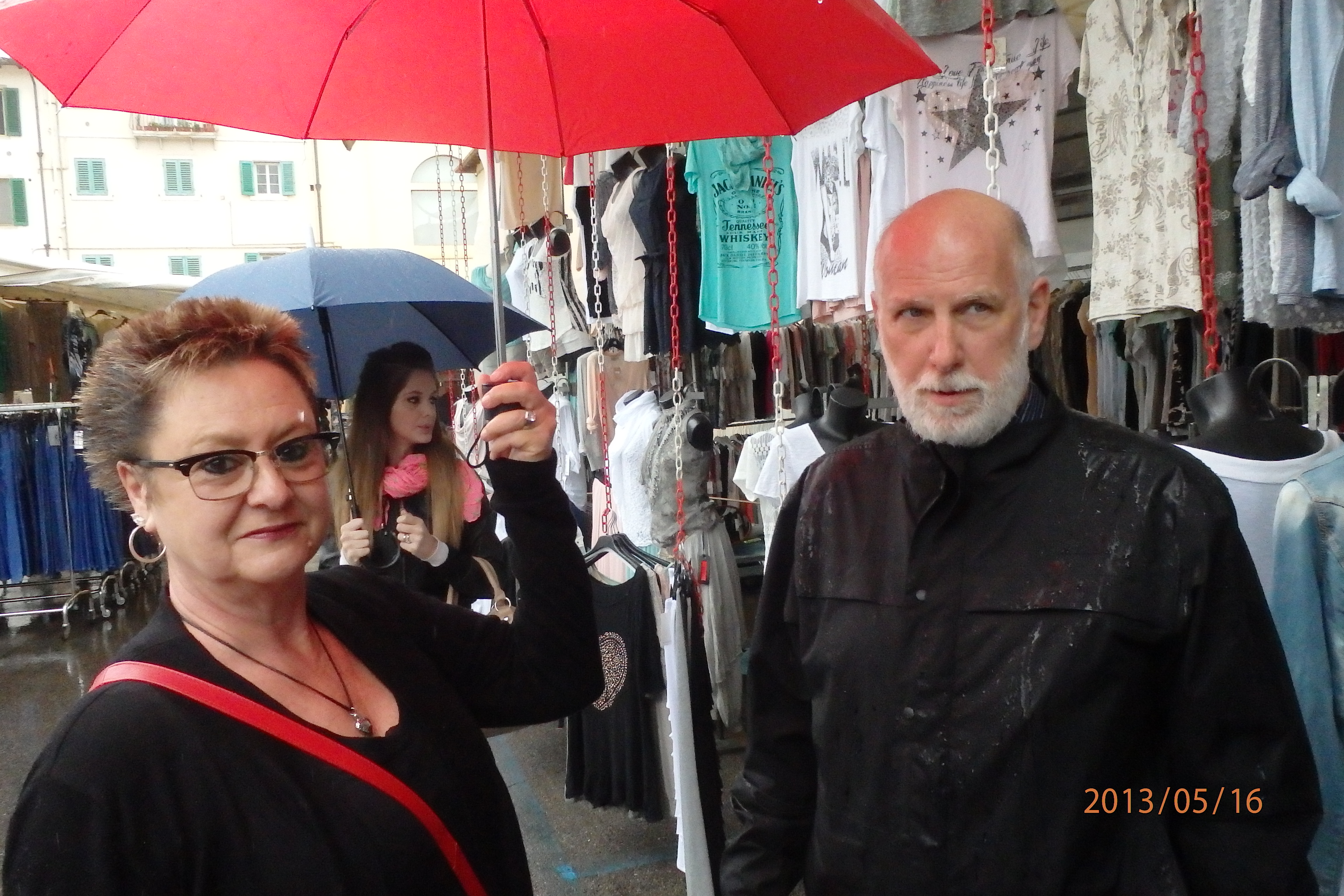 When we woke up this morning, the ladies of our group wanted to visit the weekly town market in Montevarchi.  (Sounded suspiciously like more shopping to me).  With the rain coming down and visibility dropping as we spoke, we drove off to find Montevarchi’s weekly market.  Once we got to town of Montevarchi, I directed our fearless pilot down the wrong way of a one way street only once and with all things considered, counted that as a victory.  Once in the town, Barb and Lynda sniffed out the market by observing the bags people were carrying while either walking or…….riding their bicycle while at the same time also holding an umbrella.  There are very talented people here in Italy.