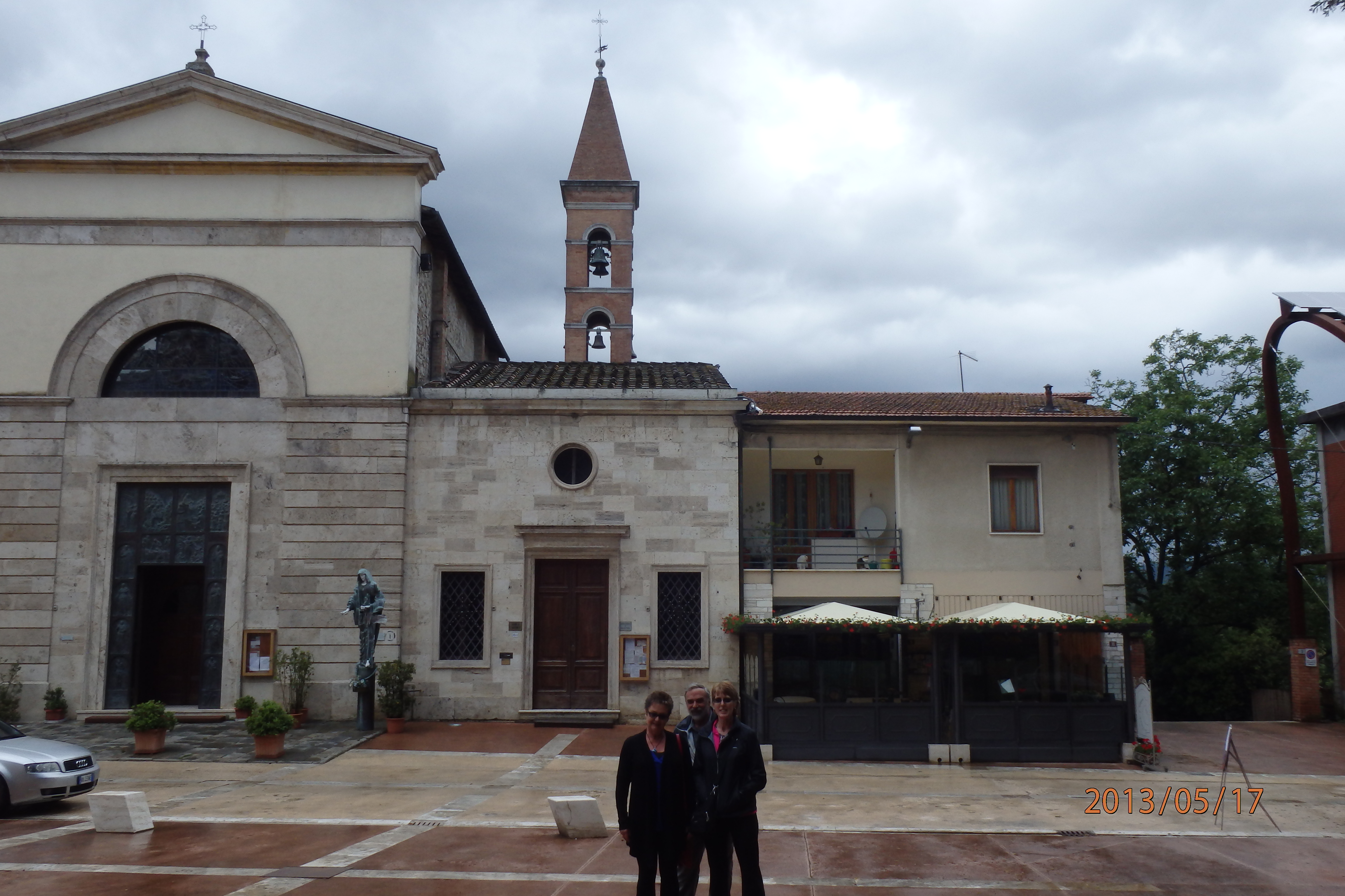 After having breakfast with our landlord Irene at one of the establishments in town, we set off later in the day for Castelnuovo Beradenga and the ancient village of San Gusme.  It began raining as soon as we left the village of Pergine Valdarno.  Castelnuovo, which means “new castle” was built in 1366.  We stopped there and explored the town square and took note of the Church of the Madonna del Patrocinio which displays a painted and glazed terracotta Madonna from the 1300’s.  You can see it in the background of this picture (and no, I’m not talking about the two ladies in the foreground dressed in black):