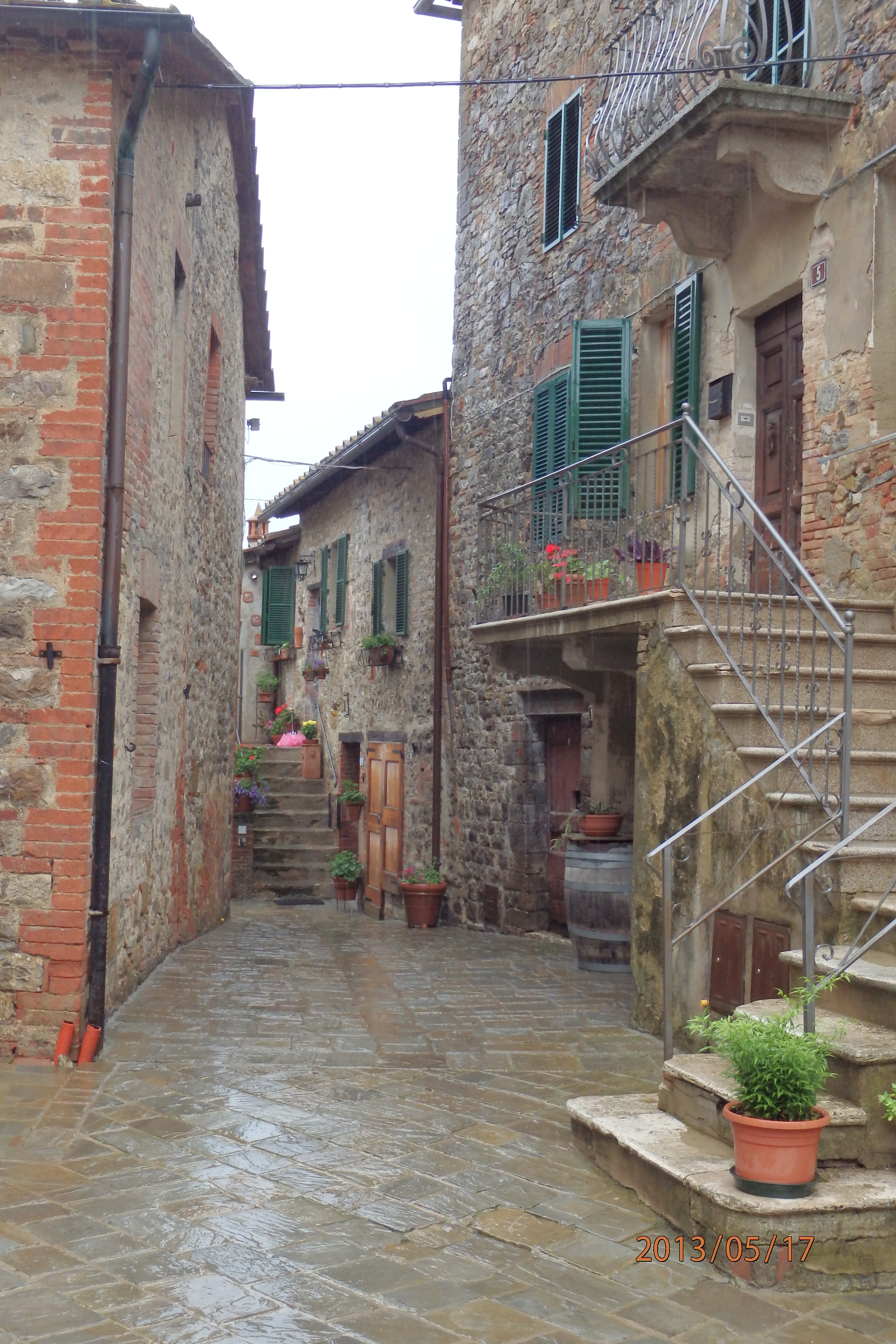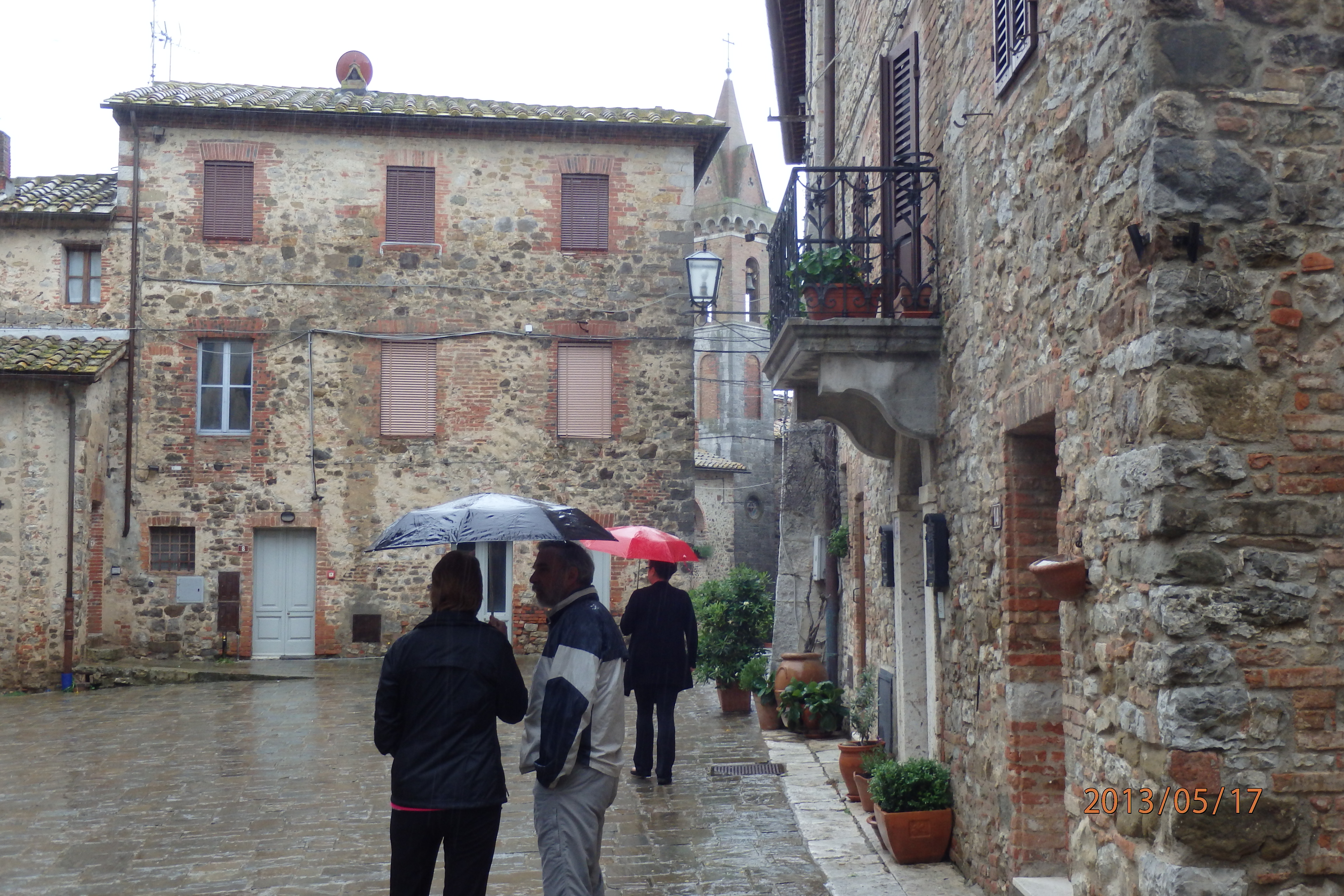 We went into the only business open during the pausa, a bar, where they made us sandwiches and we ate inside to stay out of the rain.  Finishing the sandwiches I suggested that it MIGHT be too cold to eat gelato right now.  You would have thought I told them that someone just shot President Kennedy.  Okay, okay, let’s get some gelato.  With gelato now in hand we head back in the cold rain for the safety of our BMW to eat our precious treat in the confines of the car.  Once the gelato craving was sated, we set off for the tiny hilltop village of San Gusme.  Documentation of this village dates back to the year 867.  It is absolutely spectacular and quaint as the following photos show.Image