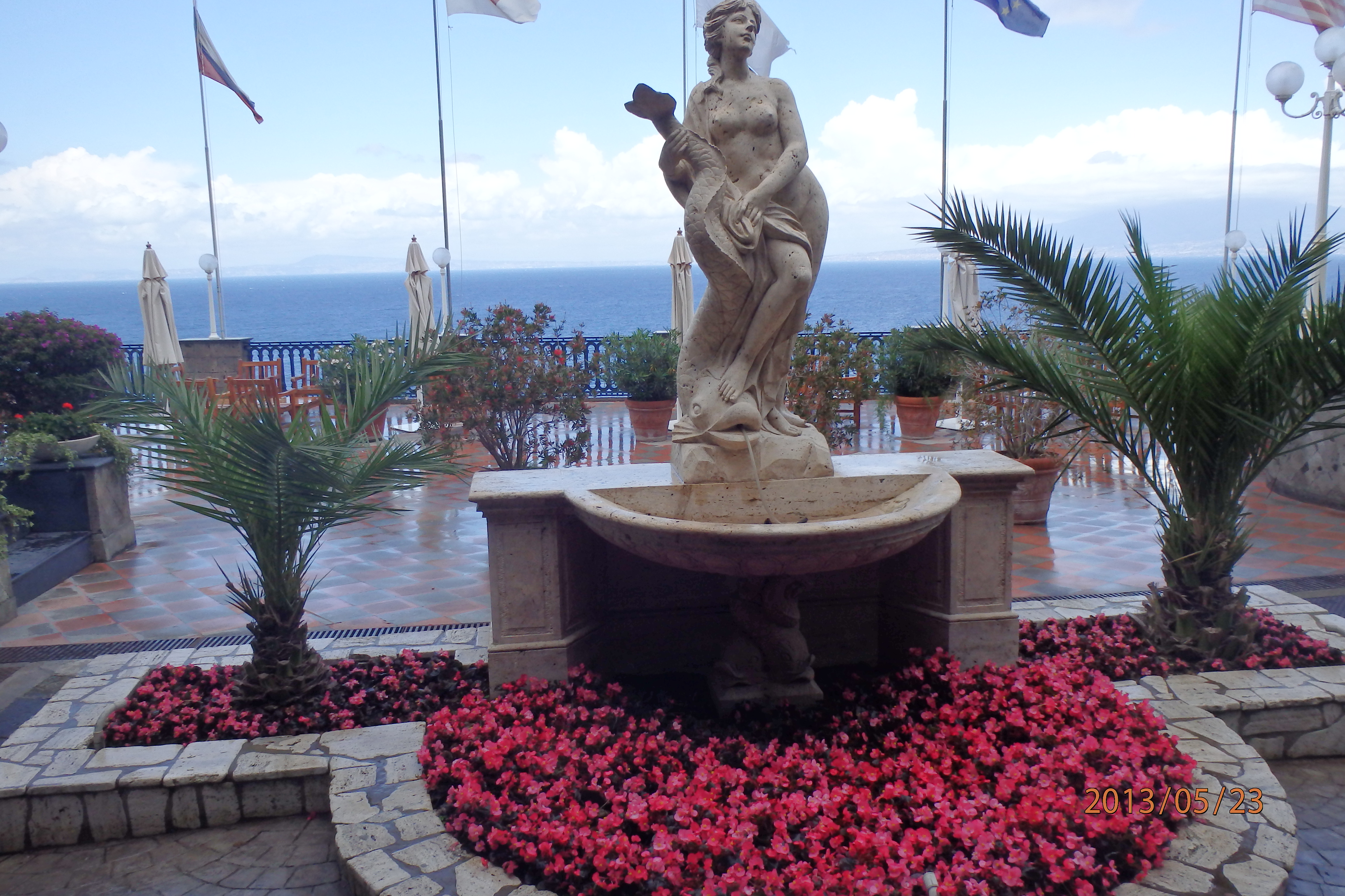 After our boat trip up the Amalfi coast we came back and rested and took off in search of dinner. Thunderstorms yesterday evening and the heaviest rainstorm we’ve ever been in were the order of the evening. Fortunately we had just purchased a couple of big umbrellas. Arriving at the restaurant (they sent a car for us) we had only a few meters to walk to enter the restaurant. Three seconds out from under the umbrella and you were soaked. A few of us had that invigorating experience. When we entered the restaurant we were instructed to leave our umbrellas in a stand by the door and we did so, our two umbrellas being the first in the stand. The meal was good. During our meal we lost power in the restaurant after some of the lightning strikes but it came back on quickly. After dinner it was still raining. Arriving at the umbrella stand I recovered ours and Barb searched for hers but it was not there. There were however were about 10 others in there now. Apparently this little umbrella holder is a community umbrella exchange location because Barb proceeded to search through the available umbrellas, trying several out and then deciding on one that seemed to strike her fancy. Now it was back home to our hotel with the HOT umbrella in Barb’s possession. I just hope I don’t see her in a pawn shop around here trying to hock it for money!