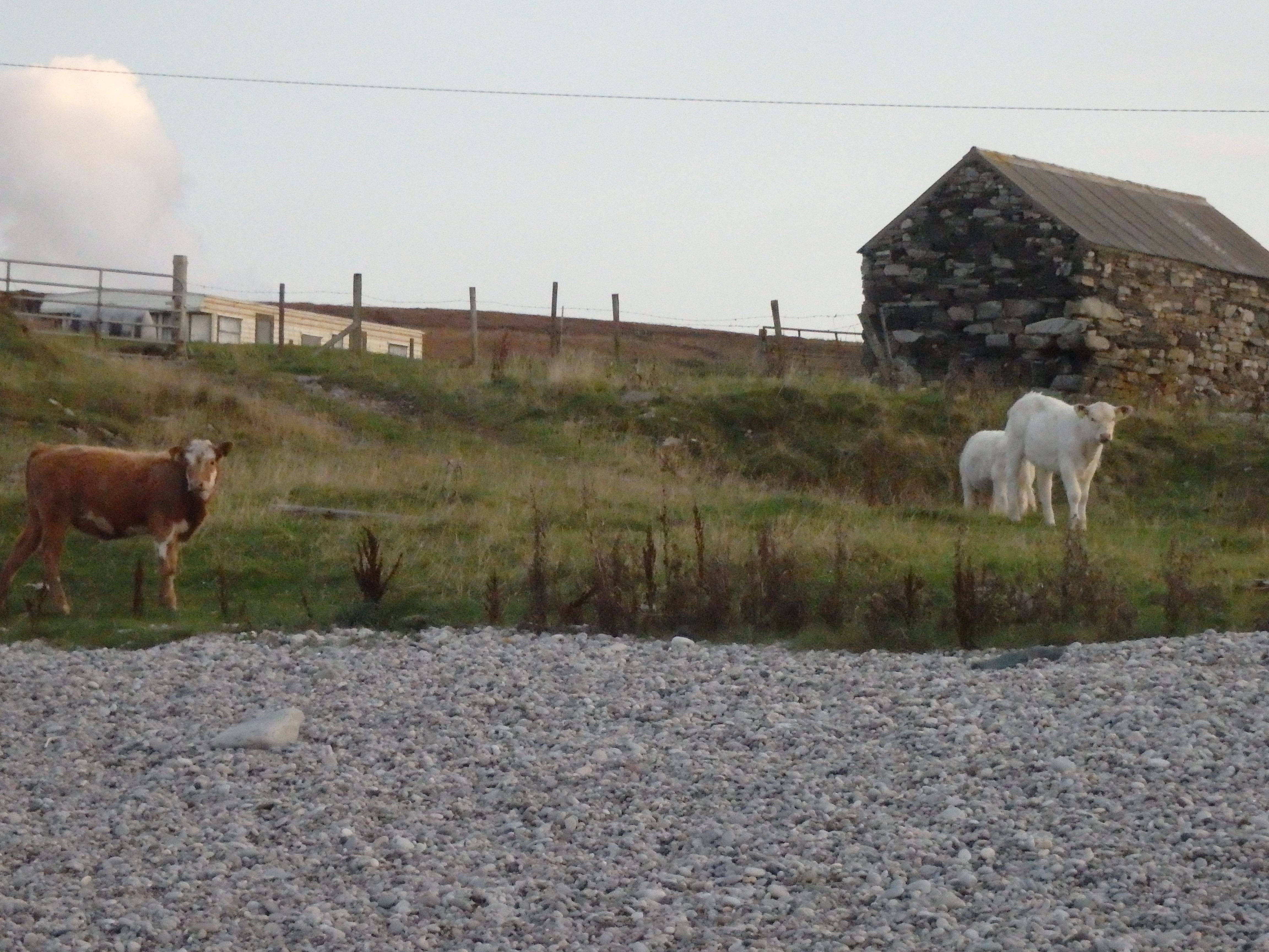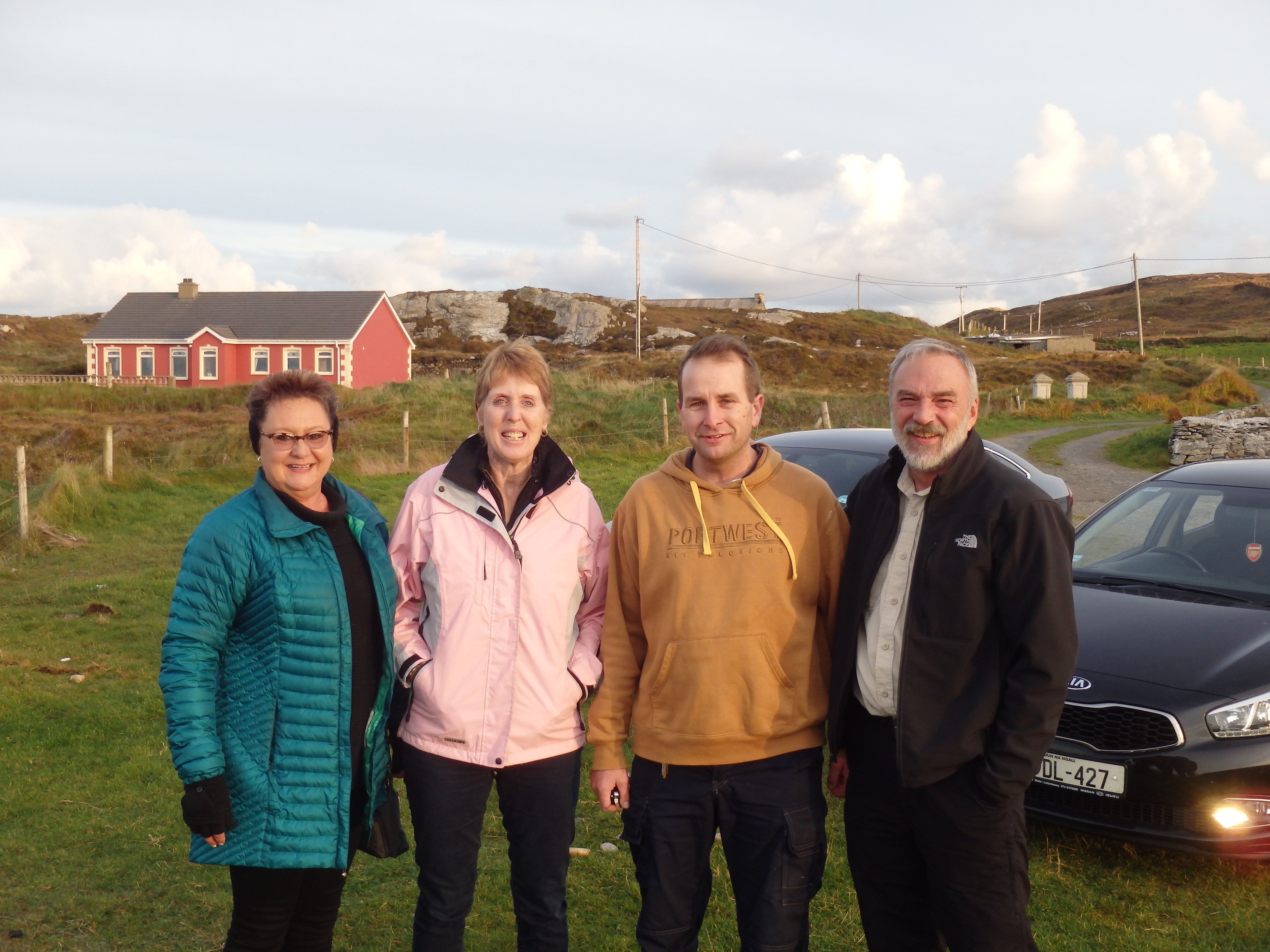 We made it to our hotel in Culdaff this afternoon in one piece. I don’t think I have ever seen so many sheep in my entire life as Ireland. They are everywhere in the fields and hillsides, even across from our hotel in Culdaff. After lunch and checking into our rooms, we headed off towards Malin Head in search of Ballyhillin beach. A beach known for agates and jasper. This is an unmarked beach in a remote location and the four of us had only a general idea where it was. Setting off on a wing and a prayer, we “happened” upon a gentleman who was stopping along the side of the road in his car. I approached him and he said yes he knows of the rock beach but he is horrible with directions. He said, “you know what, just follow me.” Driving down gravel and dirt roads and making turns in places we never would’ve found, we arrive at the rock beach. He said he has lived here all of his life and has never been to the beach but he pointed up the hill and said, “That house up there is my Granny’s.” He wished us well in our travels and was off. Here is a photo of us with our new friend. Serendipity again!! The beach was a treasure trove of semi-precious stones. We even had a cow welcoming committee to greet us as we returned to our car to travel back to Culdaff!