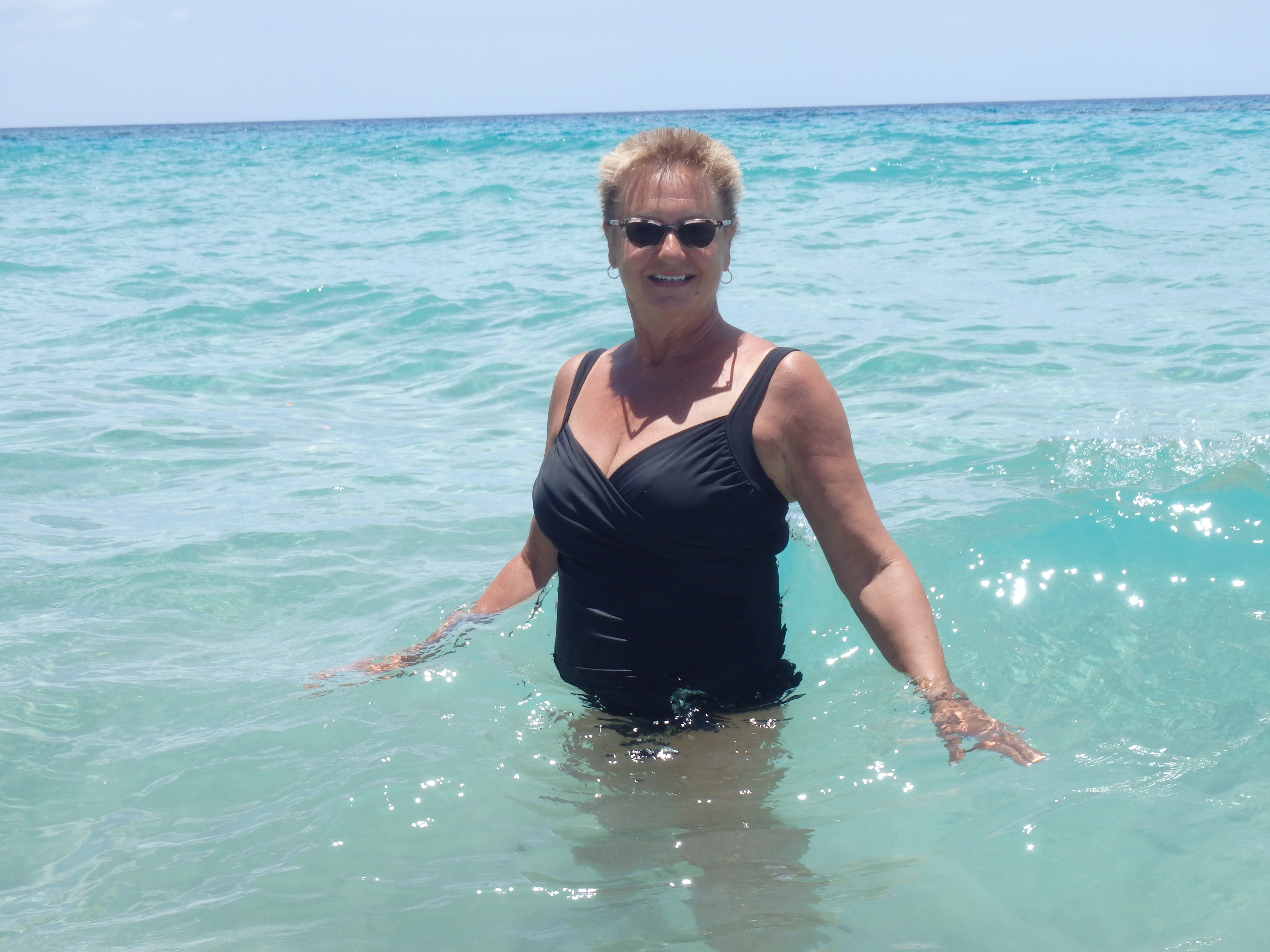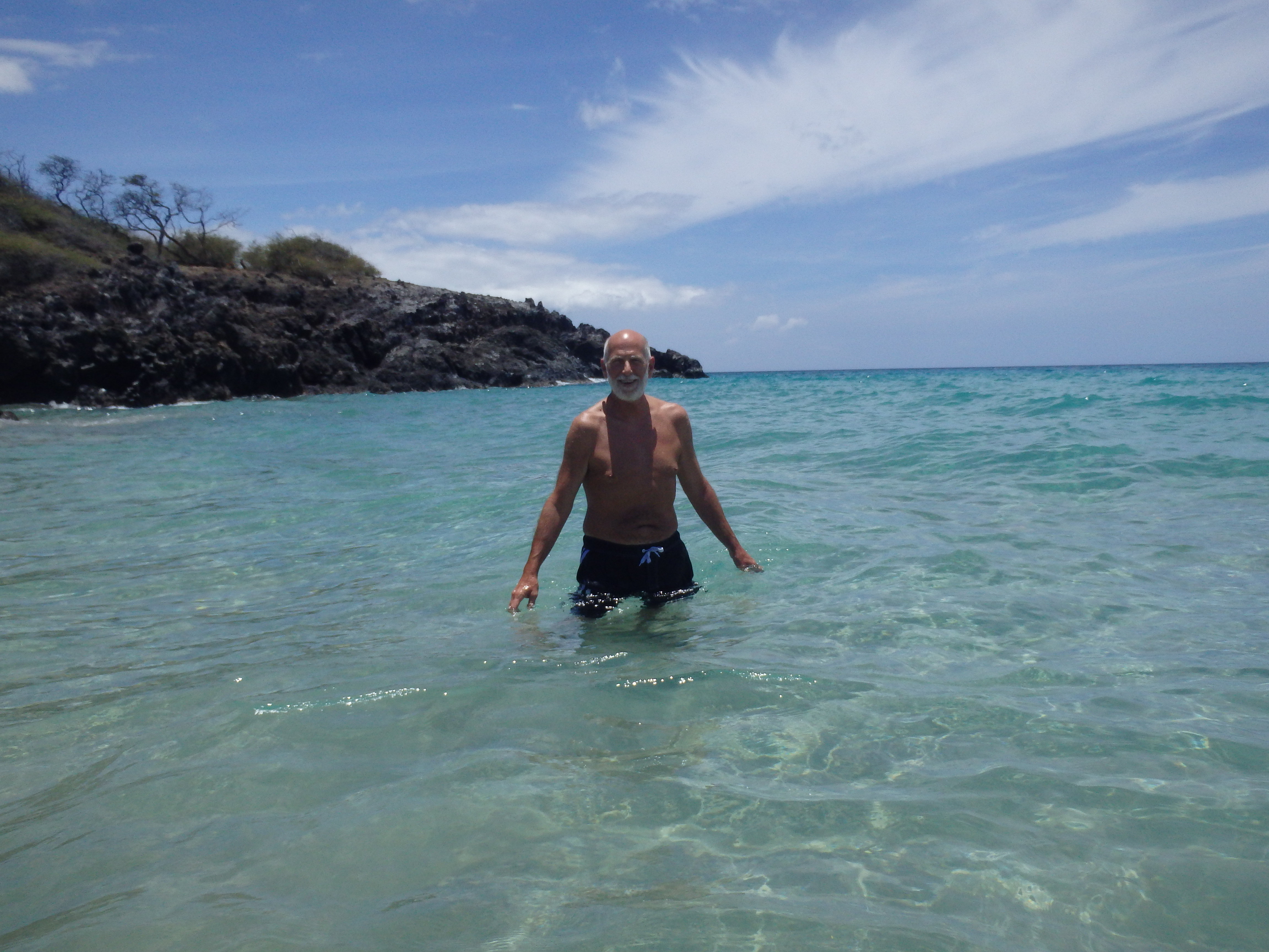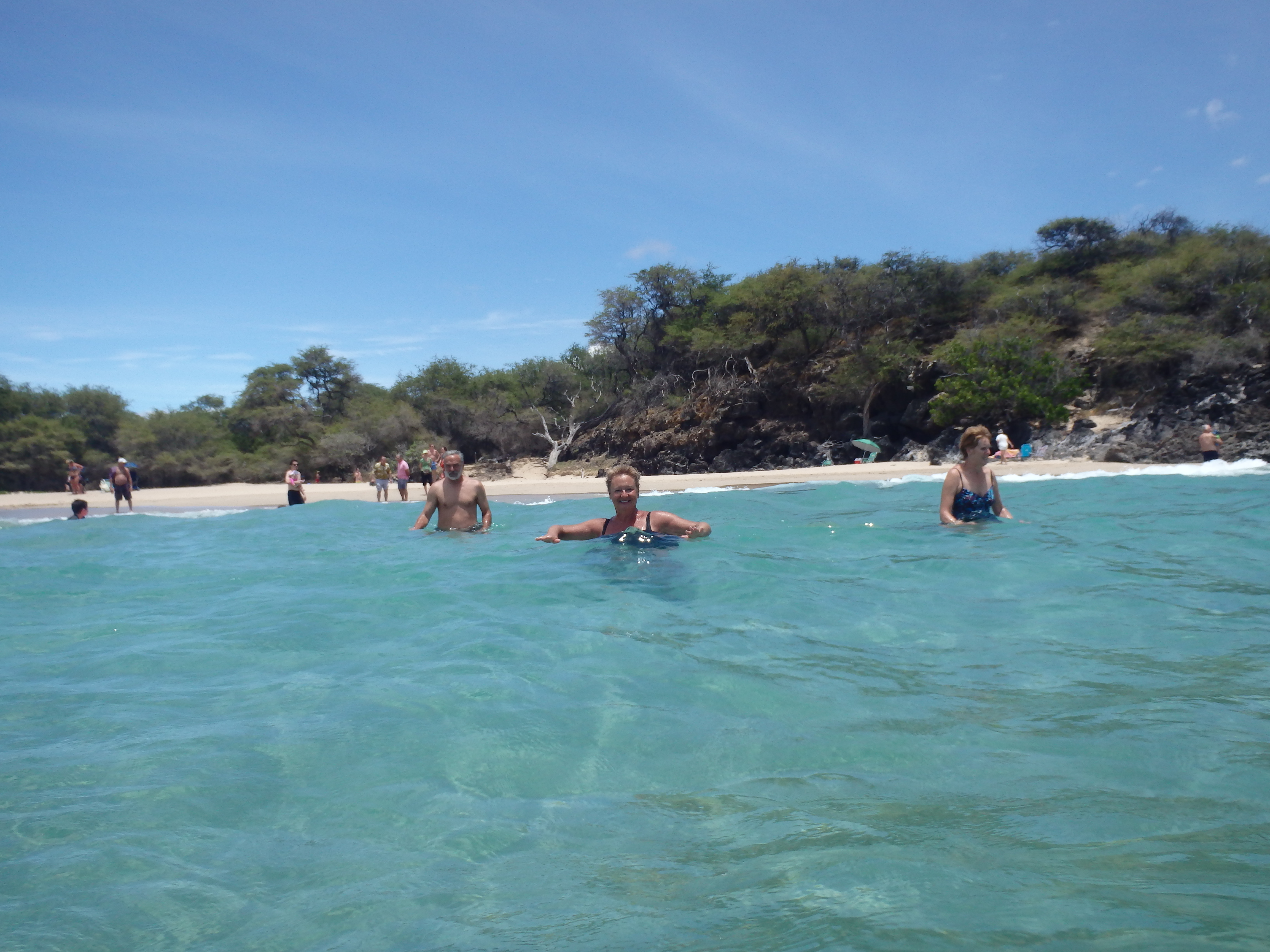 We actually did hang out around the condo for about an hour, then Barb and Lynda got the bright idea to explore north of Kona. Into the rental car we went and drove about 30 miles north to Kapuna Beach. A beautiful slice of paradise is what we found. White sand beach with gorgeous aqua water beckoned us as we arrived at this place.